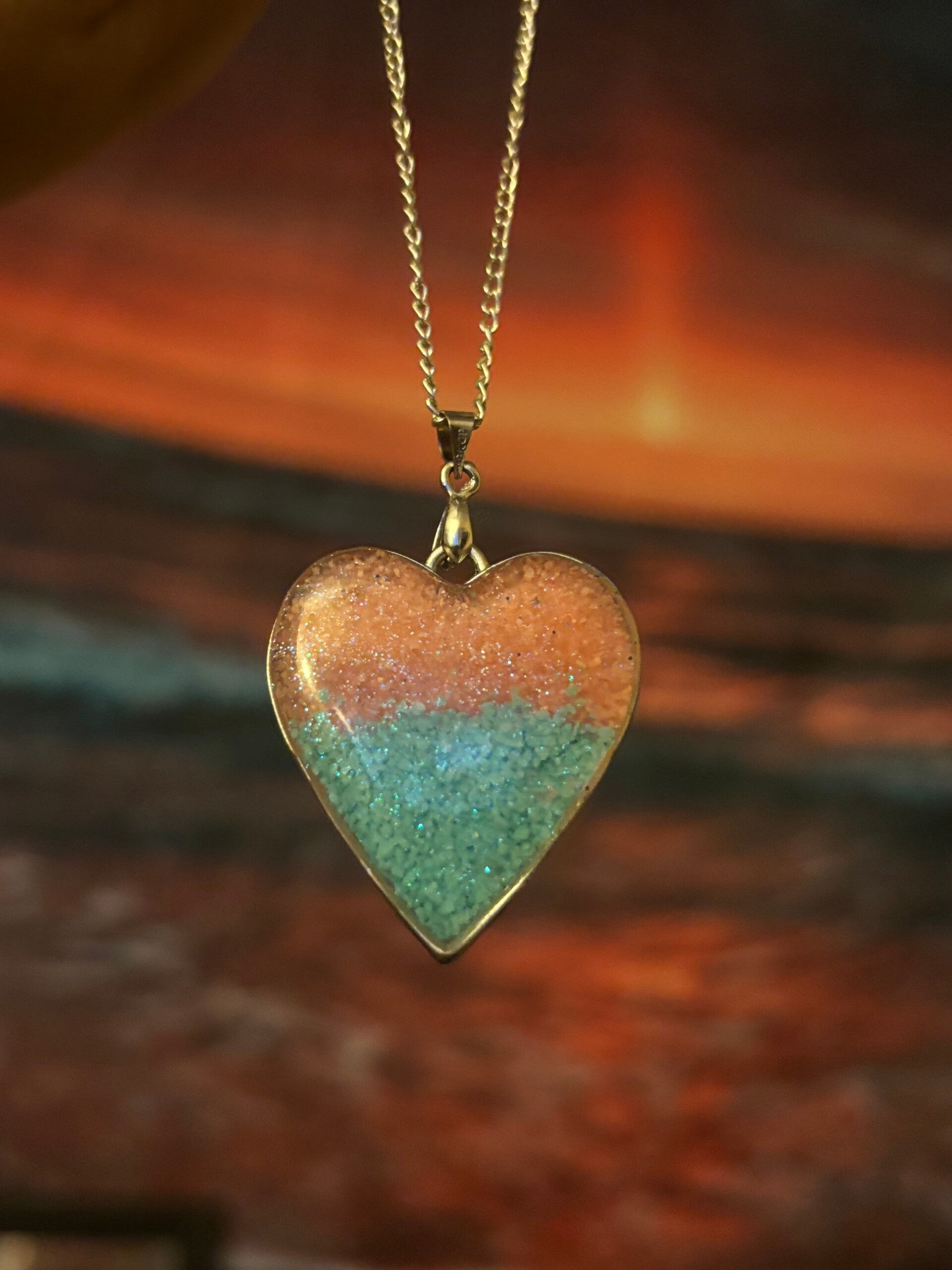 Shimmering heart pendant filled with cute pink and blue beach sand